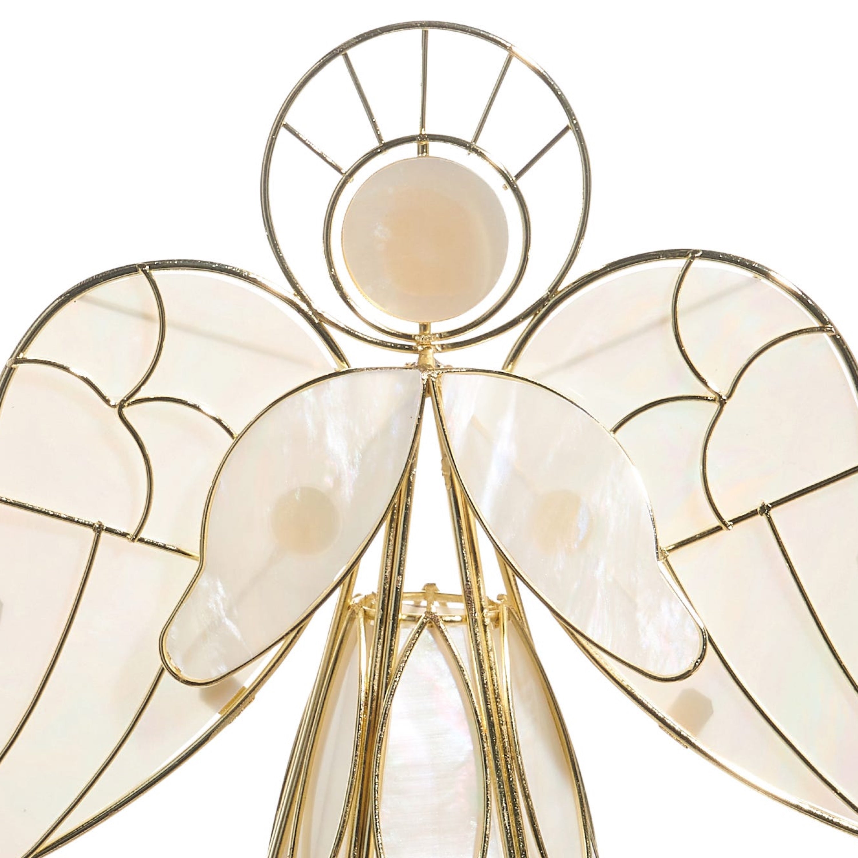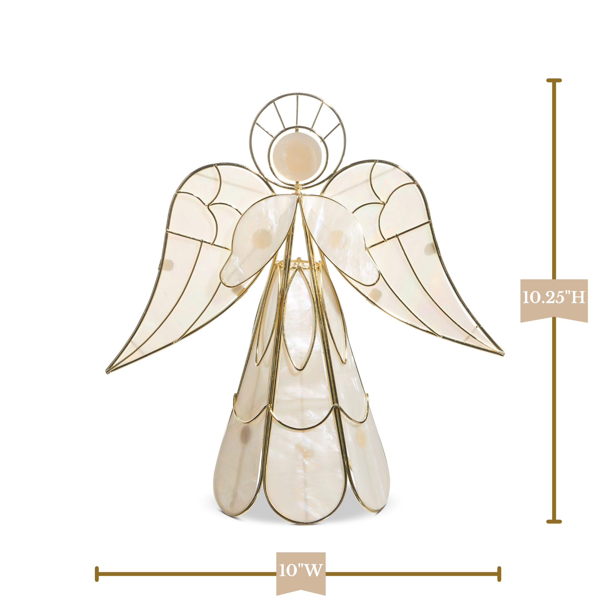 Crown your Christmas tree with heavenly beauty using this elegant Capiz pearl angel tree topper. Crafted with luminous white and pearl Capiz shell panels framed in delicate gold wire, this graceful angel brings a soft, radiant glow to your holiday décor. Measuring 10” L x 4.25” W x 10.25” H, its flowing silhouette and outstretched wings create a serene and timeless presence, making it a meaningful finishing touch for your Christmas tree.