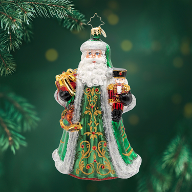 With nutcrackers and gifts and a lush emerald robe, Santa has arrive in refined Christmas attire—ready to dazzle all that acquaint him. This exclusive ornament cannot be found at Christoper Radko and has been hand-picked by the Radko team to be part of retailer exclusive collection for select premier Christmas retailers.