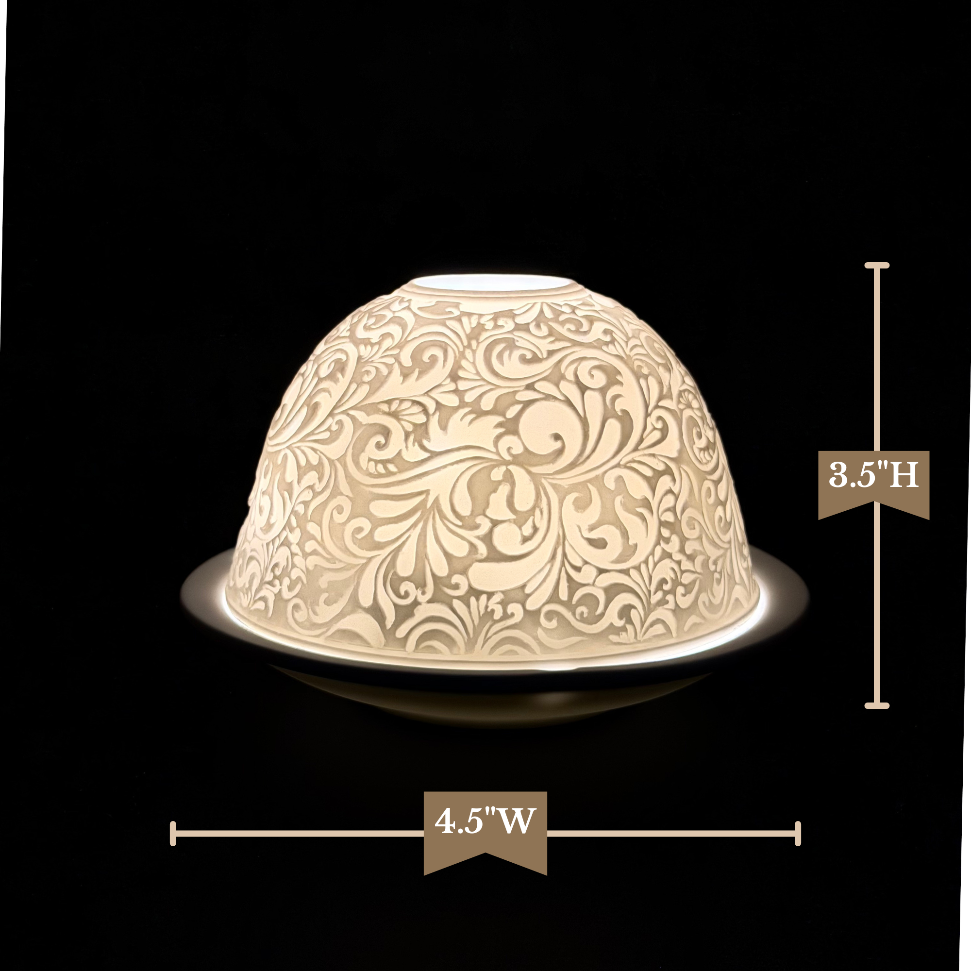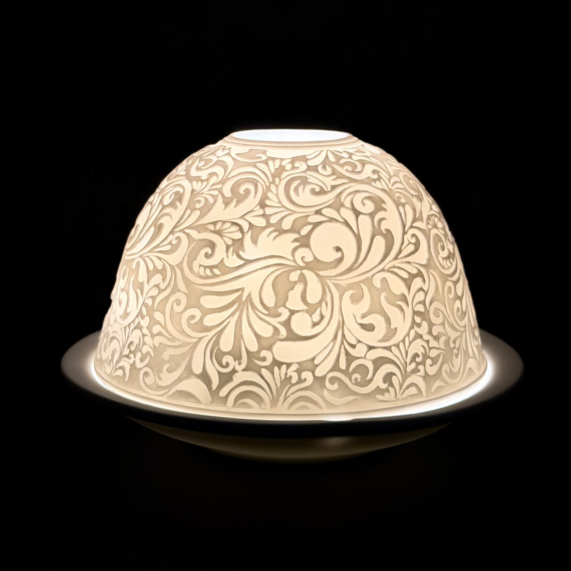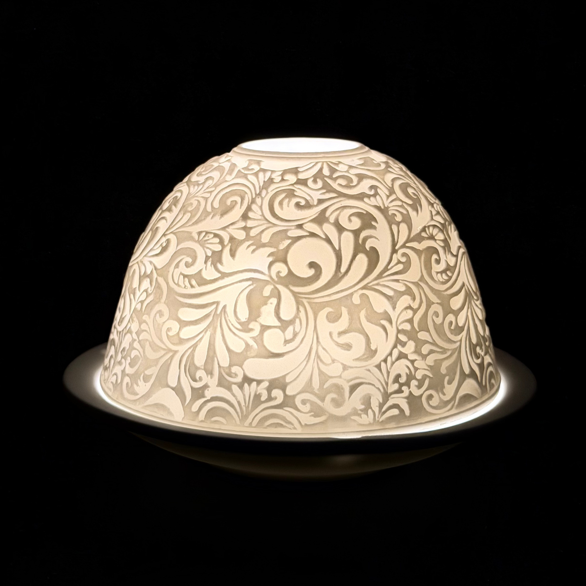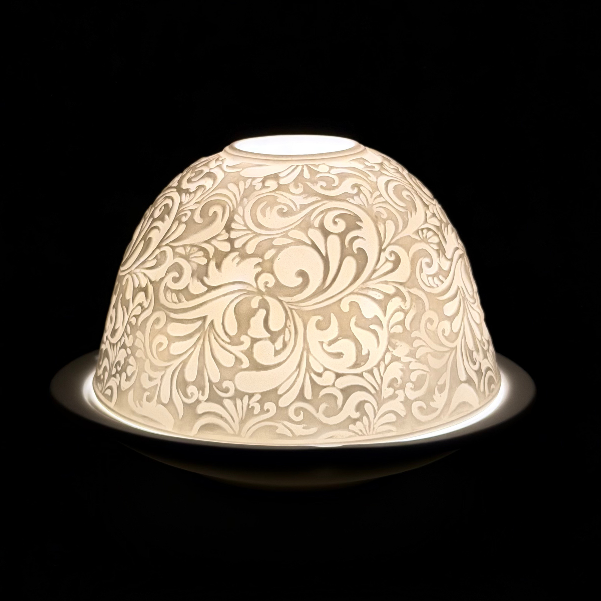 Intricate scrolling paisley patterns wrap this porcelain votive in timeless detail, creating a refined accent that glows beautifully when illuminated. When paired with a candle, the carved design radiates a warm golden light that adds depth, texture, and quiet sophistication to any space. Created in Germany by the skilled artisans at Hellmann Versand.