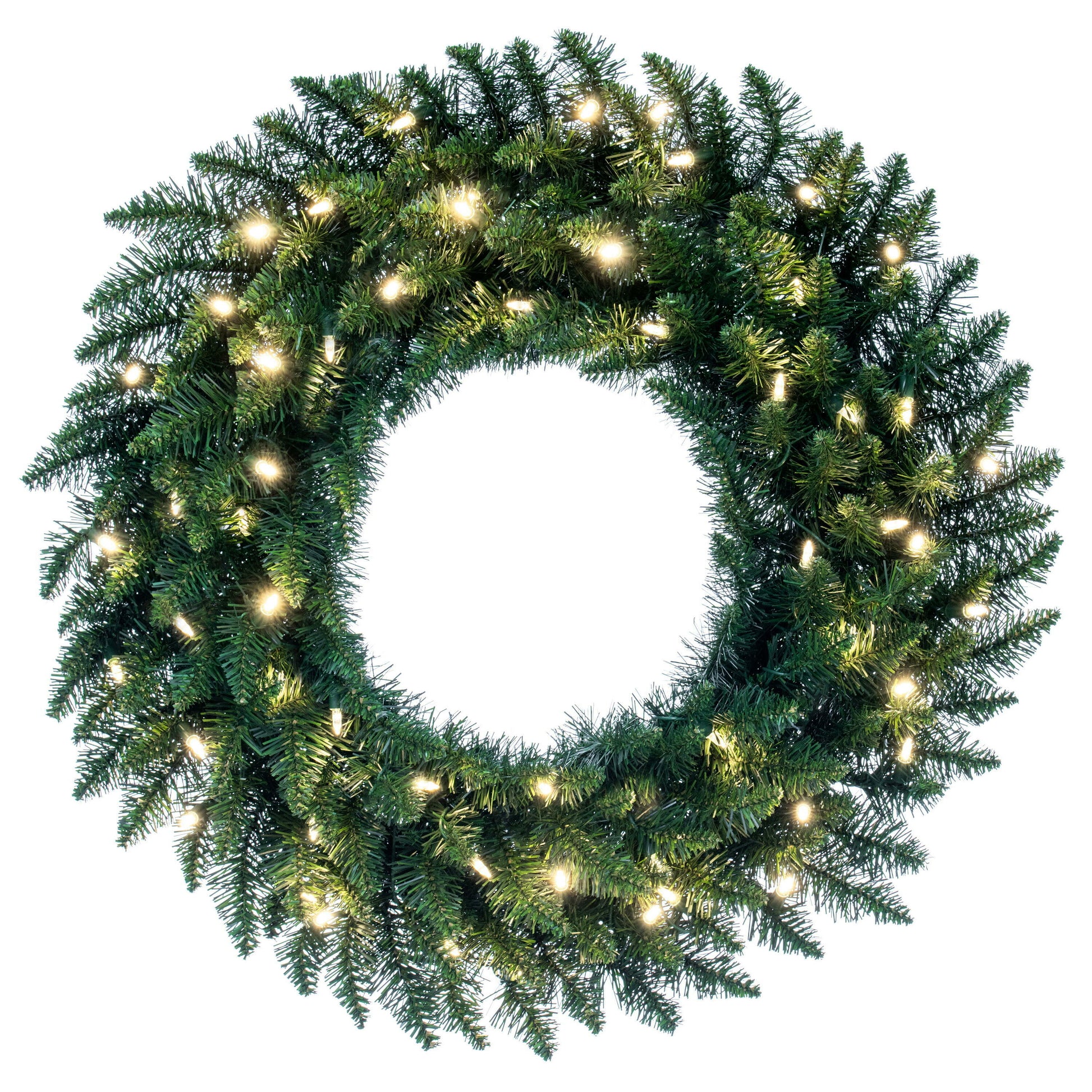 Add timeless holiday charm to your home with the Camdon Fir Artificial Christmas Wreath. Designed with lush, traditional green PVC tips, this classic wreath offers a full and natural look, perfect for dressing up your front door, mantle, or wall décor. Its versatile design can be enjoyed as-is or customized with your favorite ornaments, ribbons, or festive picks. Available in three options, this wreath fits every decorating style. Choose the unlit version for a clean, natural foundation, or enjoy the convenience of pre-lit styles. The pre-lit wreaths are strung with energy-efficient Italian LED mini lights—available in multi-colored for a vibrant holiday glow or warm white for a cozy, classic ambiance. Each lighted style runs on 120V AC and includes a convenient on/off step switch for easy control.