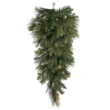 Bring elegance to your holiday decorating with the 36-inch Emerald Mixed Fir Artificial Christmas Teardrop Swag. Designed with 104 flocked green PVC and PE/Hardneedle tips, this lush piece captures the look of fresh evergreens and is accented with seven natural pine cones for added rustic charm. Perfect for doors, mantels, or walls, it provides a festive touch to any space. The pre-lit version features 100 warm white Dura-Lit® LED mini lights powered by 120v. Built with advanced technology, these lights remain glowing even if one bulb goes out. For those who prefer to design their own display, the unlit option allows complete customization with ribbons, ornaments, or additional lights. Both styles are recommended for indoor use only, ensuring lasting seasonal beauty year after year.