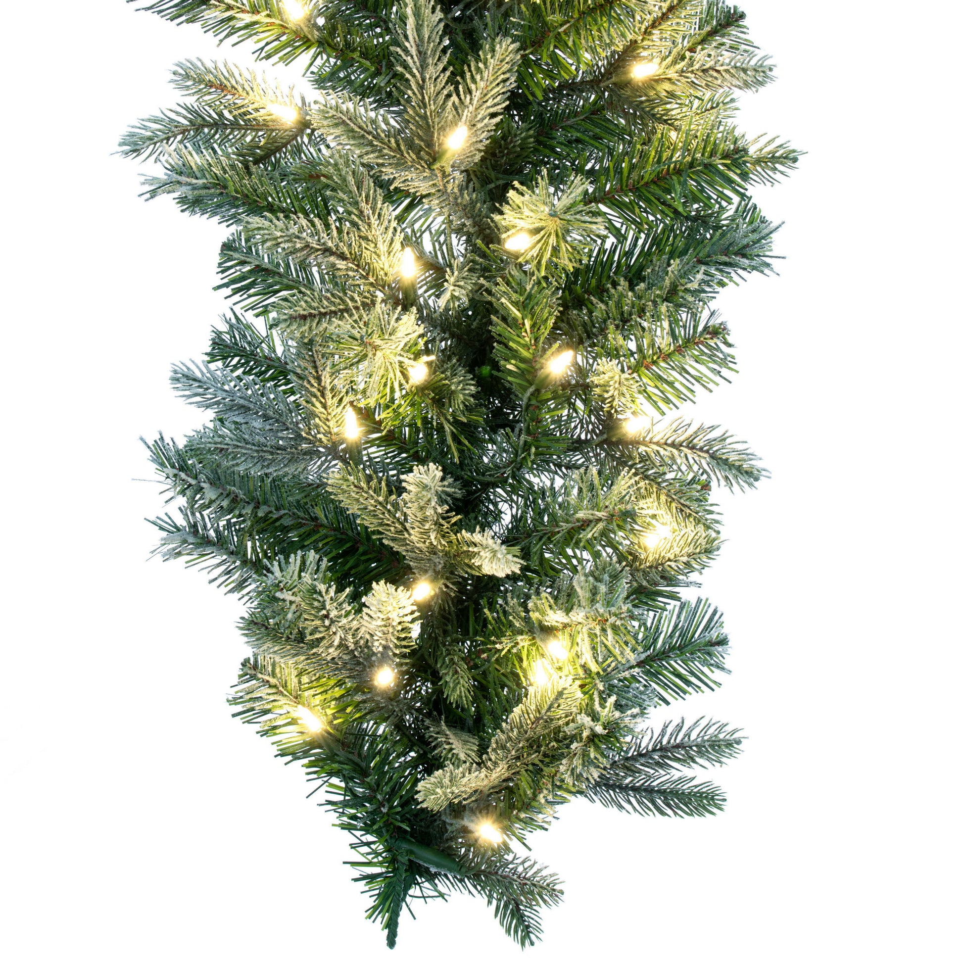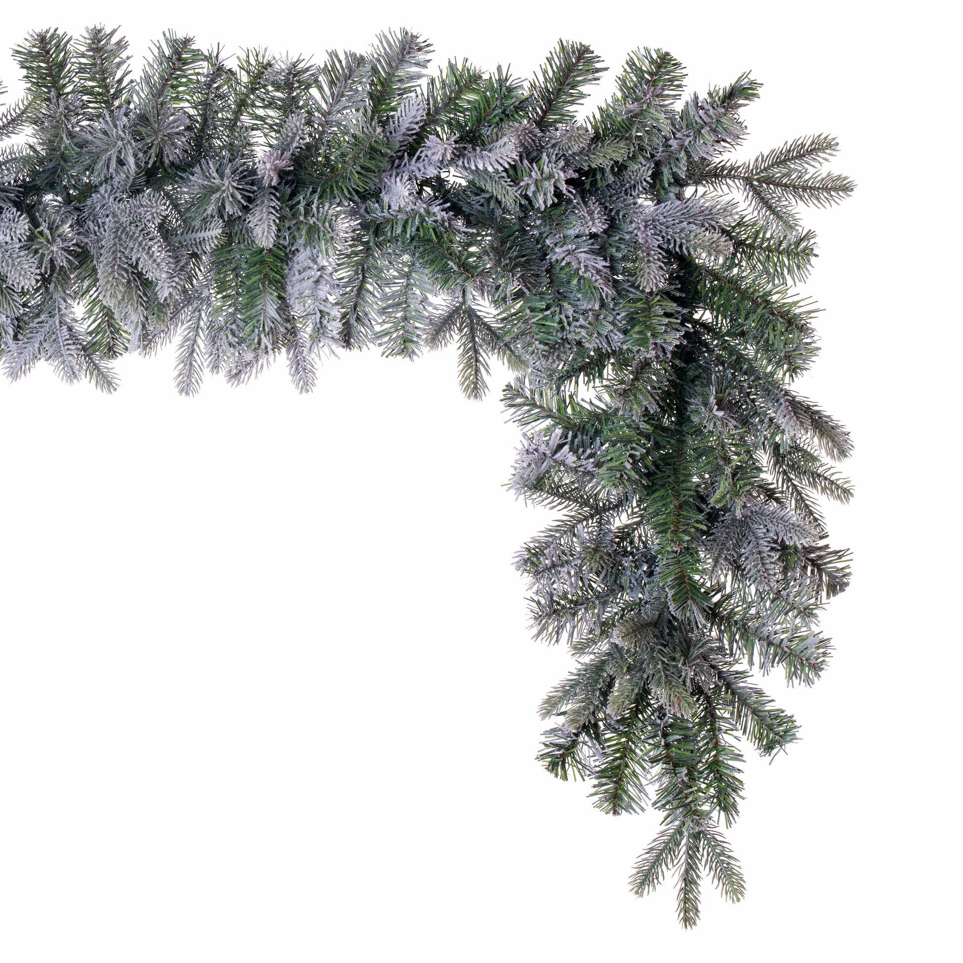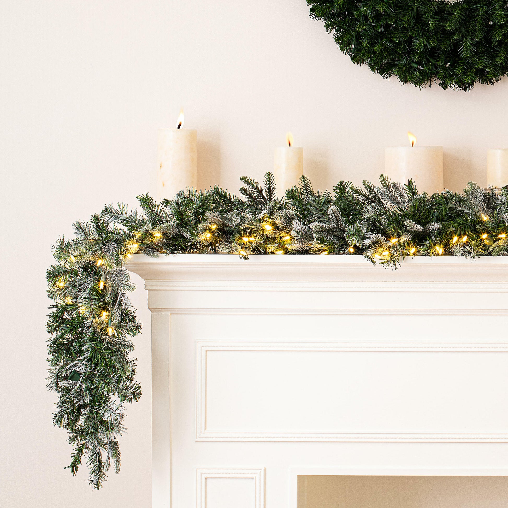 - 9’ x 14” garland with a lush mix of frosted PE and PVC tips for a natural, snow-dusted appearance