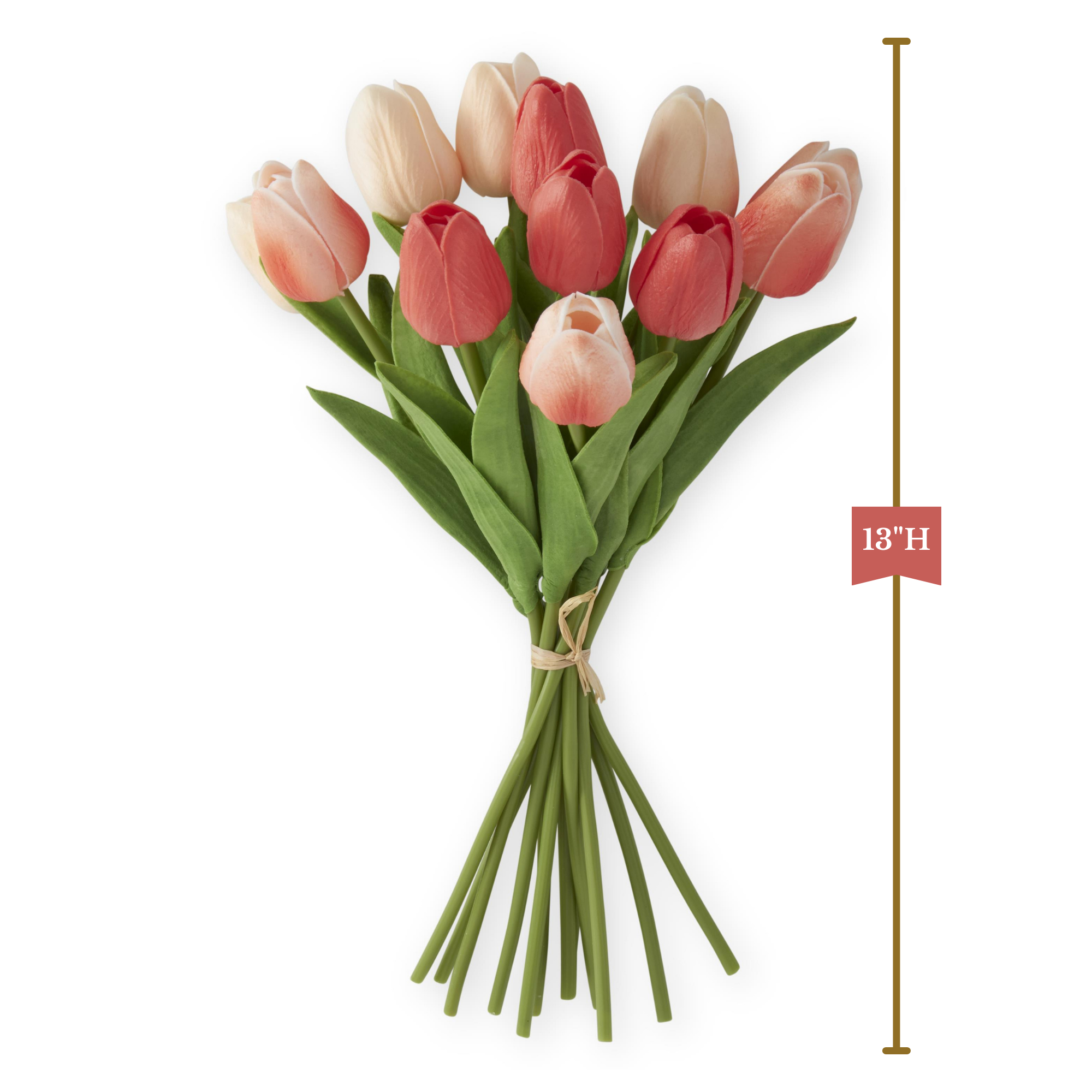 Bring the beauty of spring indoors with this lifelike bundle of Real Touch tulips. Each 12-stem bouquet is designed with soft petals that look and feel like freshly cut tulips, complete with vibrant green silk leaves for a natural finish. Whether displayed alone in a vase or combined with other florals, these tulips add a touch of elegance and charm to your home décor. Perfect for brightening up dining tables, entryways, or gifting as a thoughtful arrangement. The perfect flowers for Spring and easter decorating!
