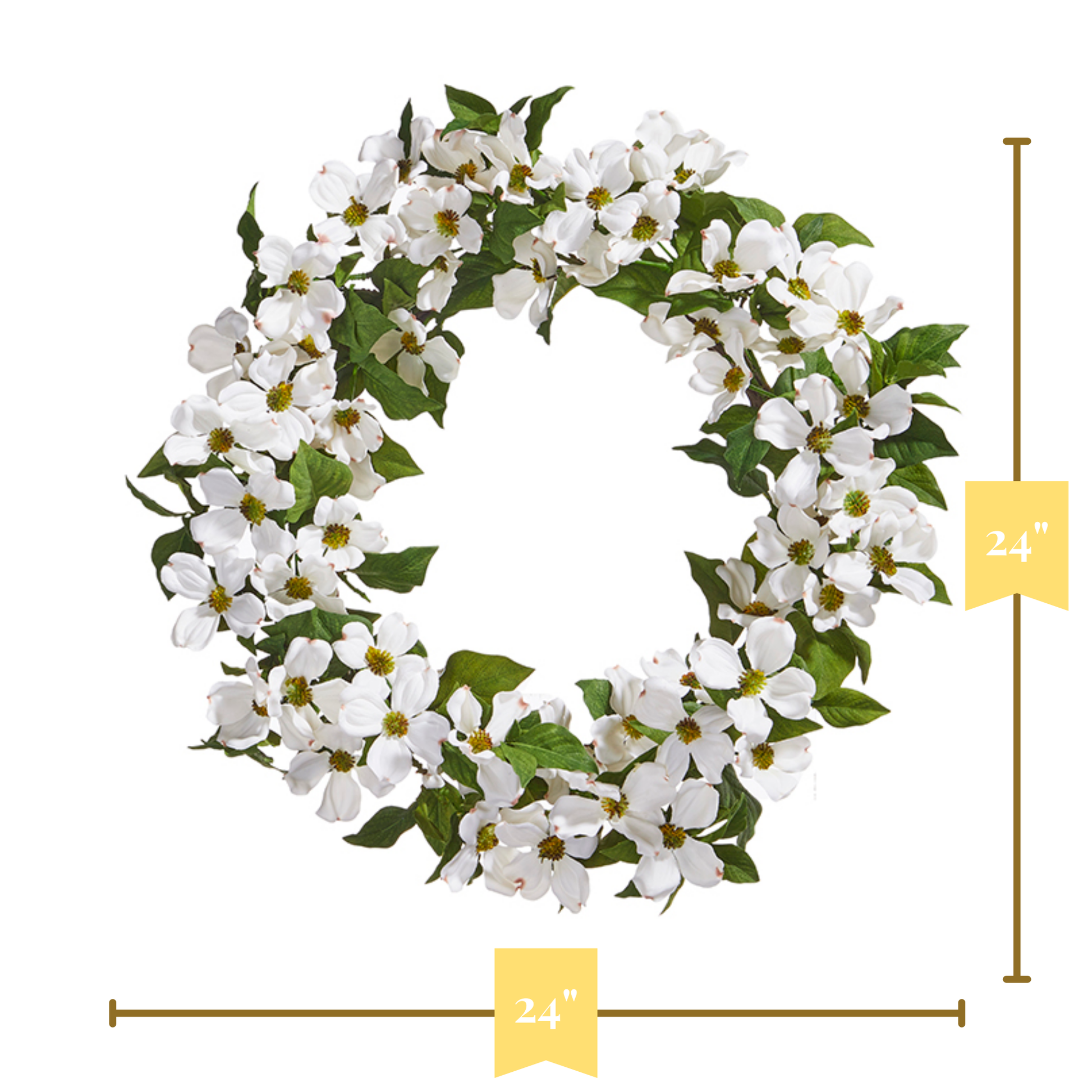 This stunning 24” wreath brings the beauty of spring and summer into your home with its elegant white dogwood flowers. Crafted from high-quality polyester and plastic, this wreath offers a lifelike appearance that requires no maintenance. Perfect for adding a touch of freshness to your front door, mantel, or any wall, this wreath offers year-round charm and seasonal beauty.
