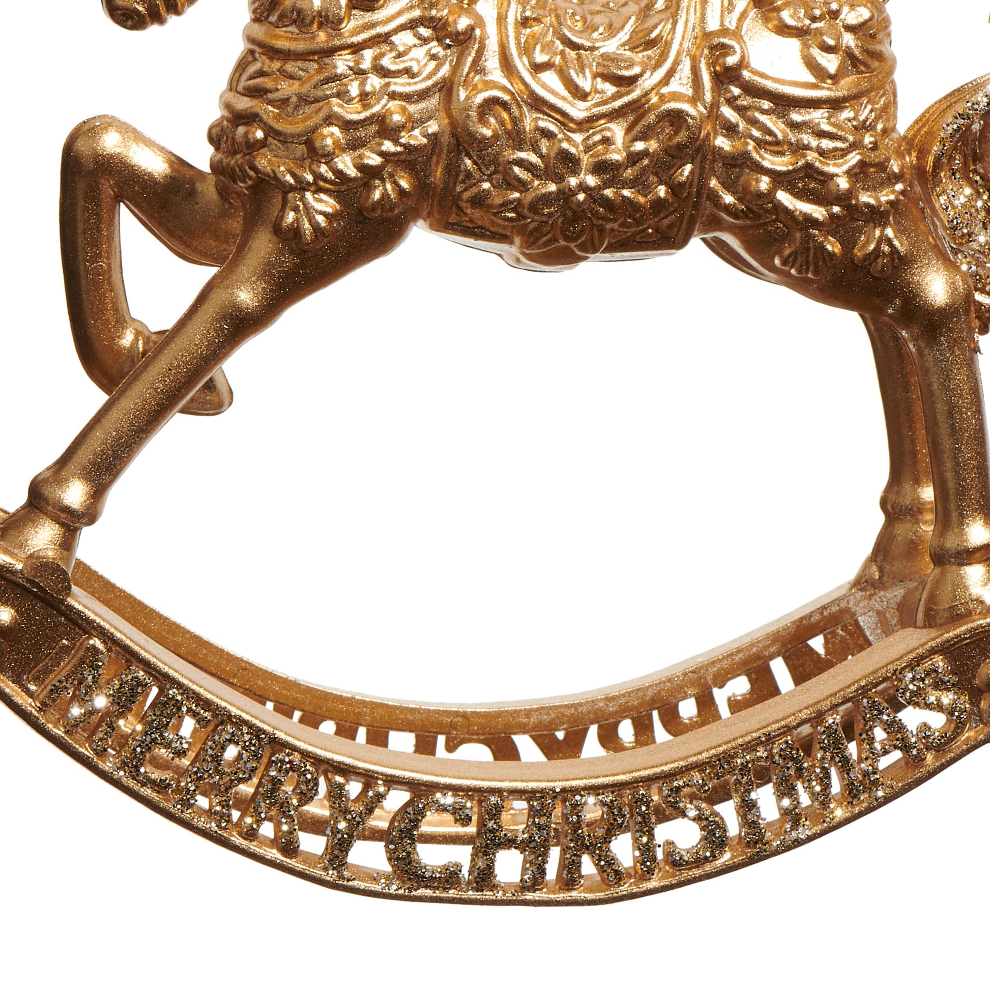 Celebrate the joy of the season with this regal rocking horse ornament, crafted with elegance and charm. Measuring 5.5”L x 1.25”W x 5.5”H, this ornament features a royal gold finish that exudes sophistication and adds a vintage-inspired touch to your Christmas tree. Made from durable plastic, the intricate details of the rocking horse, paired with a “Merry Christmas” message, bring a festive and timeless quality to your holiday décor. Perfect for those who love traditional holiday styles, this ornament will become a cherished part of your seasonal decorations.