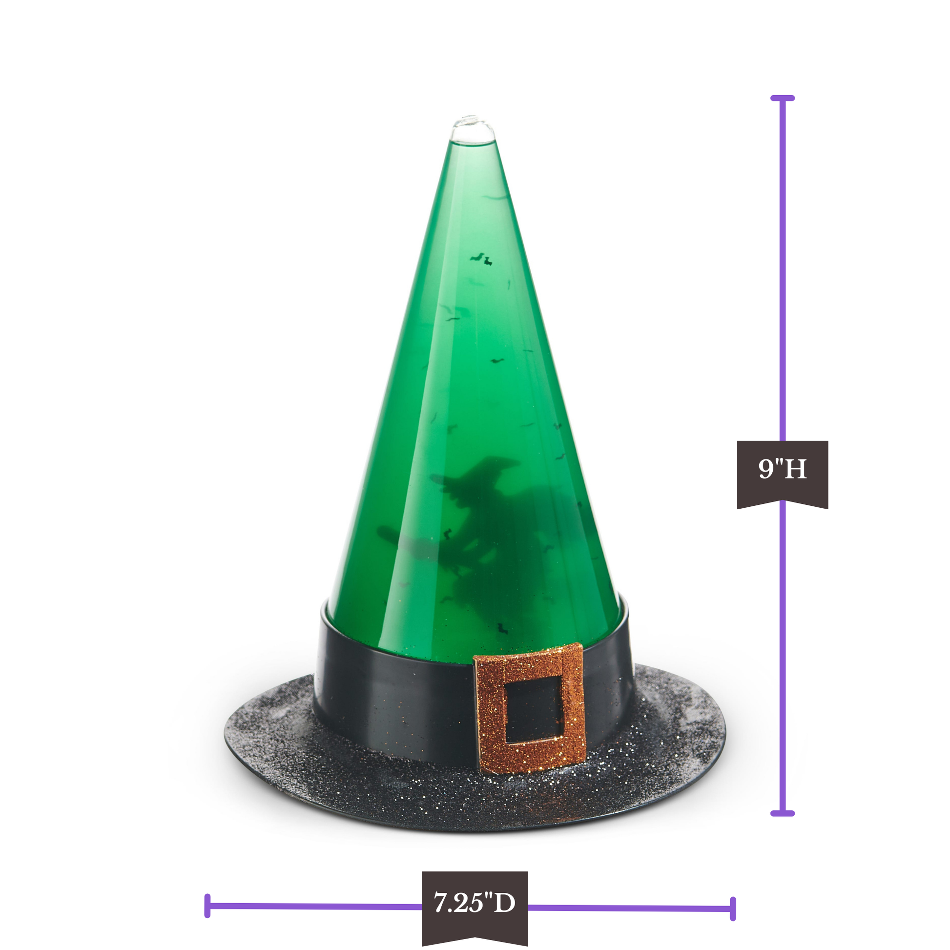 Add a spellbinding glow to your Halloween décor with this lighted swirling bats glitter water hat, inspired by classic witchy charm and spooky elegance. Featuring a green glittered foggy water effect inside a pointed witch hat silhouette, this enchanting decoration creates continuous swirling motion that brings bats and shimmer to life. Crafted from plastic and filled with water and glitter, it measures 7.25” D x 9” H and includes a built-in 6 hour timer that repeats every 18 hours. Perfect for tabletops, mantels, or party displays, this piece is a must-have for Wicked, Wicked Witch of the West, and Elphaba fans alike.