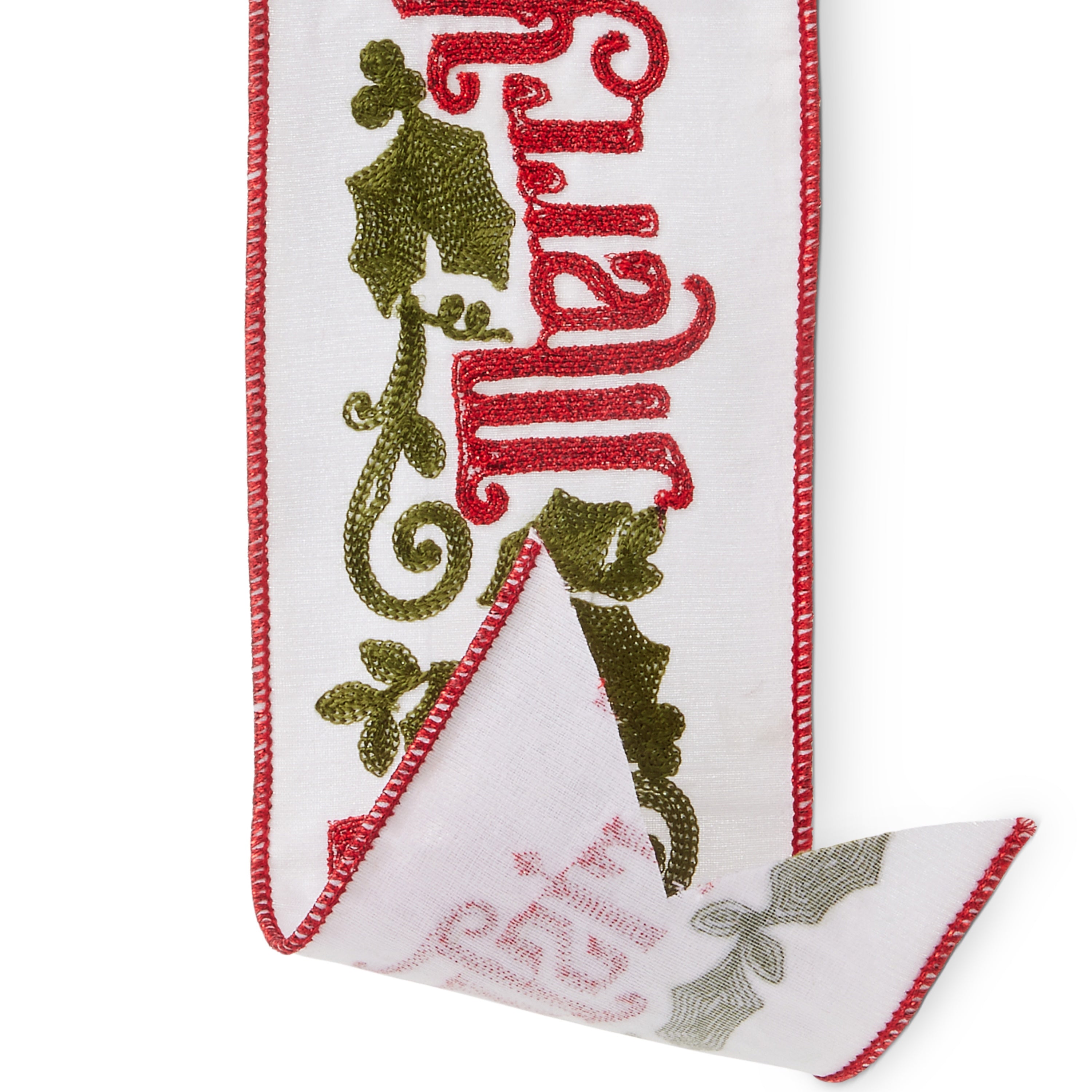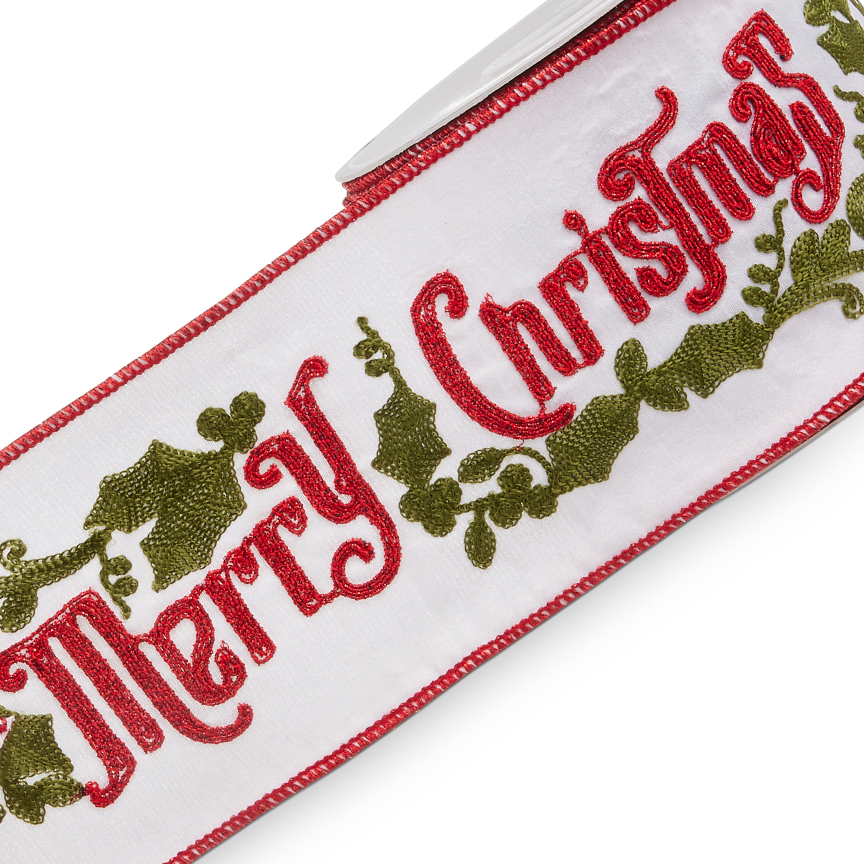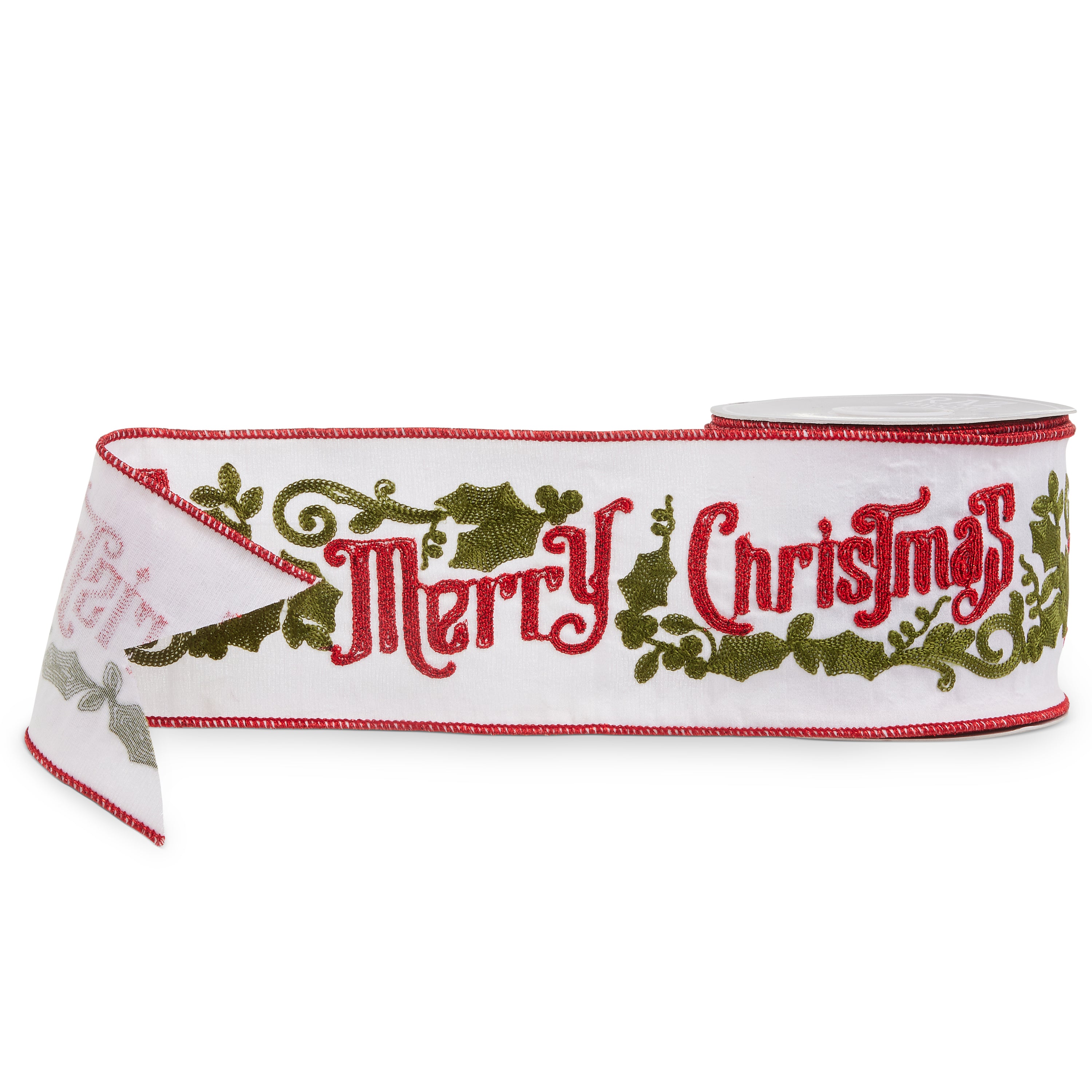 Celebrate the season with a timeless “Merry Christmas” message beautifully embroidered across a crisp white background. Framed with elegant holly scrollwork and festive red trim, this ribbon adds traditional charm to trees, wreaths, and holiday gift wrapping.