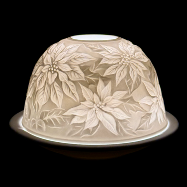 Celebrate the elegance of the season with this refined porcelain votive light, adorned with intricately sculpted poinsettias and winter foliage. Radiating a soft, golden glow when illuminated, this handcrafted piece evokes the beauty of a peaceful holiday evening. Created in Germany by the skilled artisans at Hellmann Versand, this votive light brings a botanical sophistication to your mantel, dining table, or entryway. Product Dimensions: 3.5” H x 4.5” W x 4.5” D. Set Includes: One dome and one matching tray.