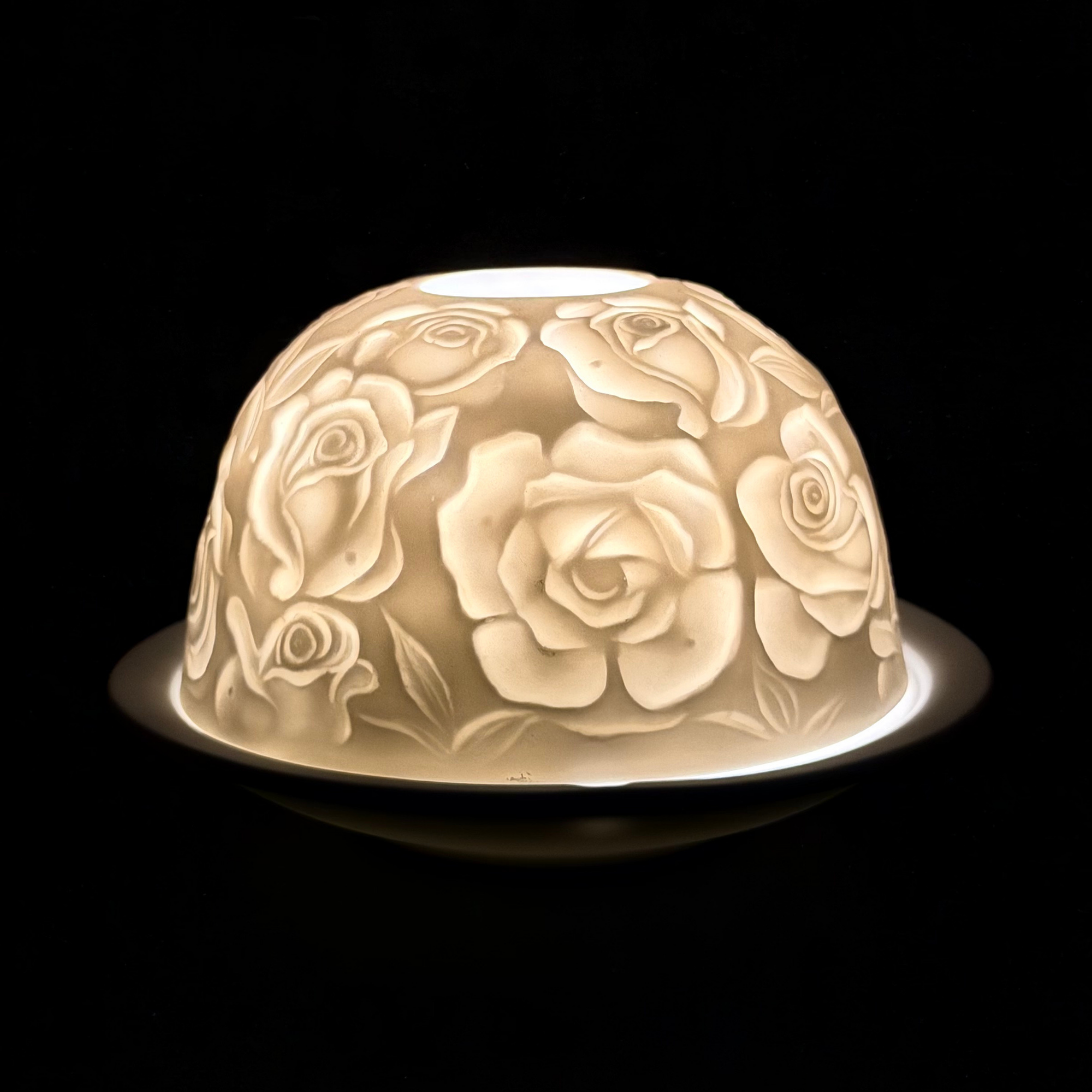 Delicate rose blooms unfold in soft porcelain relief, creating a romantic and serene accent that glows beautifully when illuminated. This elegant votive light transforms simple candlelight into a warm, golden display of floral artistry. Created in Germany by the skilled artisans at Hellmann Versand.