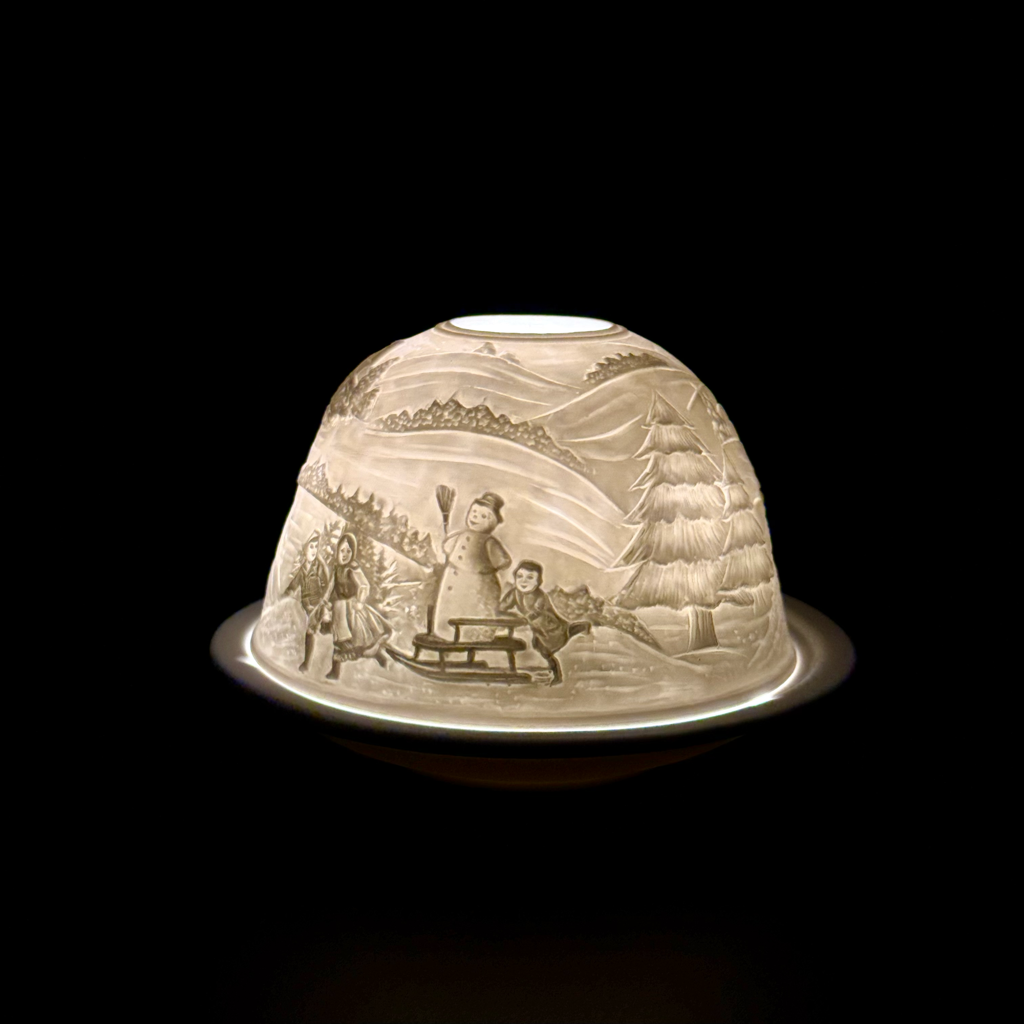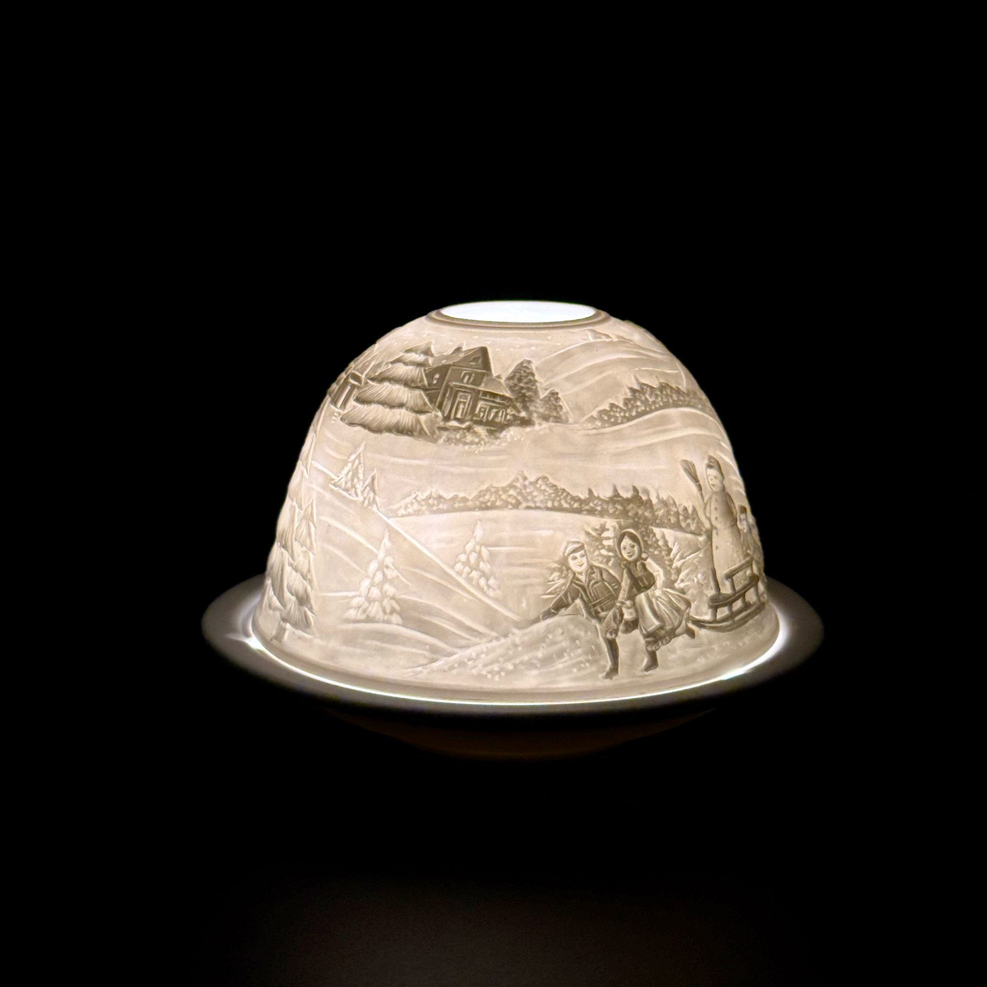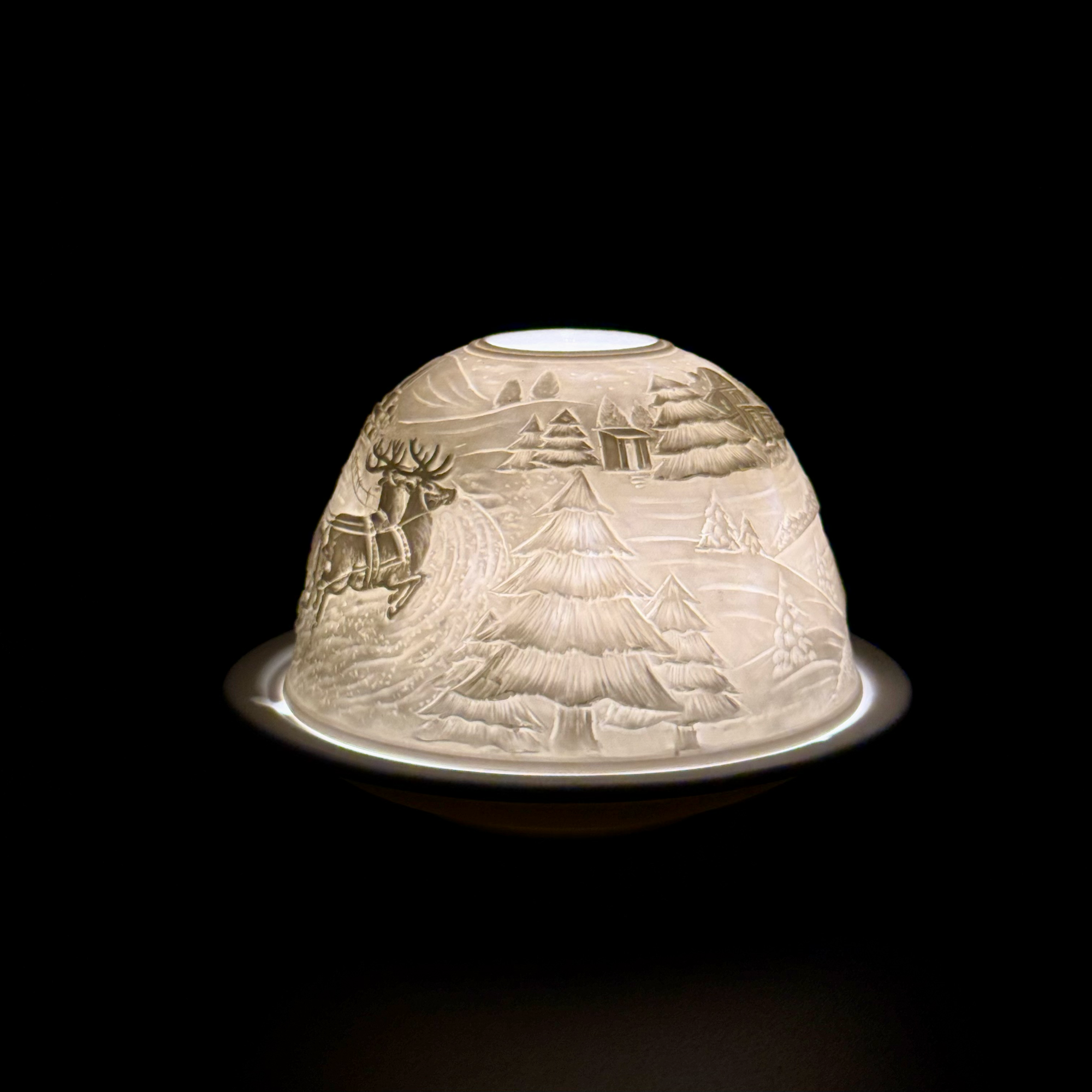 Bring the magic of Christmas Eve to life with this exquisitely detailed porcelain votive light, featuring a nostalgic scene of Santa’s sleigh and reindeer dashing through a wintry village. Handcrafted in Germany by Hellmann Versand, this enchanting dome glows softly when paired with the Starlight LED Lighted Base (sold separately), casting a warm and serene ambiance throughout your space. A stunning accent for mantels, holiday tablescapes, or entryway displays. Product Dimensions: 3.5” H x 4.5” W x 4.5” D. Set Includes: One dome cover and one base tray