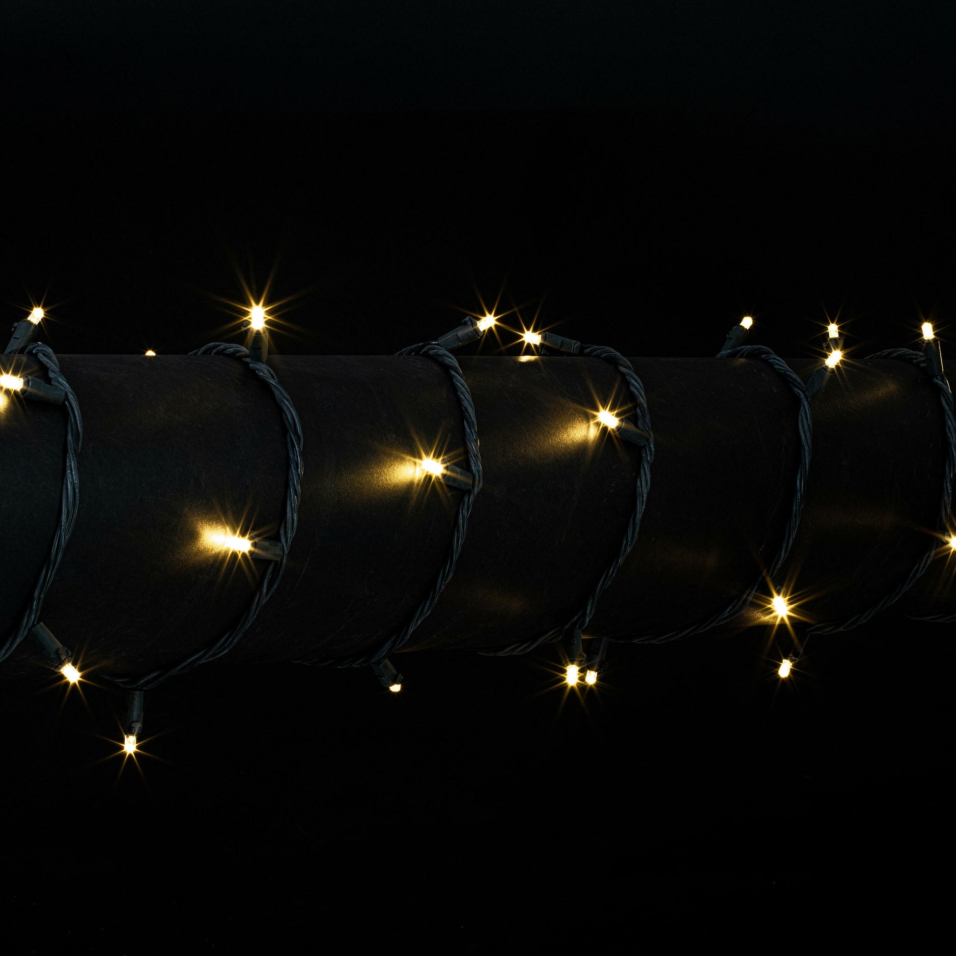 lluminate your holiday décor with this 34-foot strand of 100 warm white wide-angle LED lights on a black wire. Designed for both indoor and outdoor use, these energy-efficient LEDs provide a consistent, warm glow, enhancing the festive ambiance of your space. The black wire seamlessly blends with darker backgrounds, making it ideal for various decorating needs.