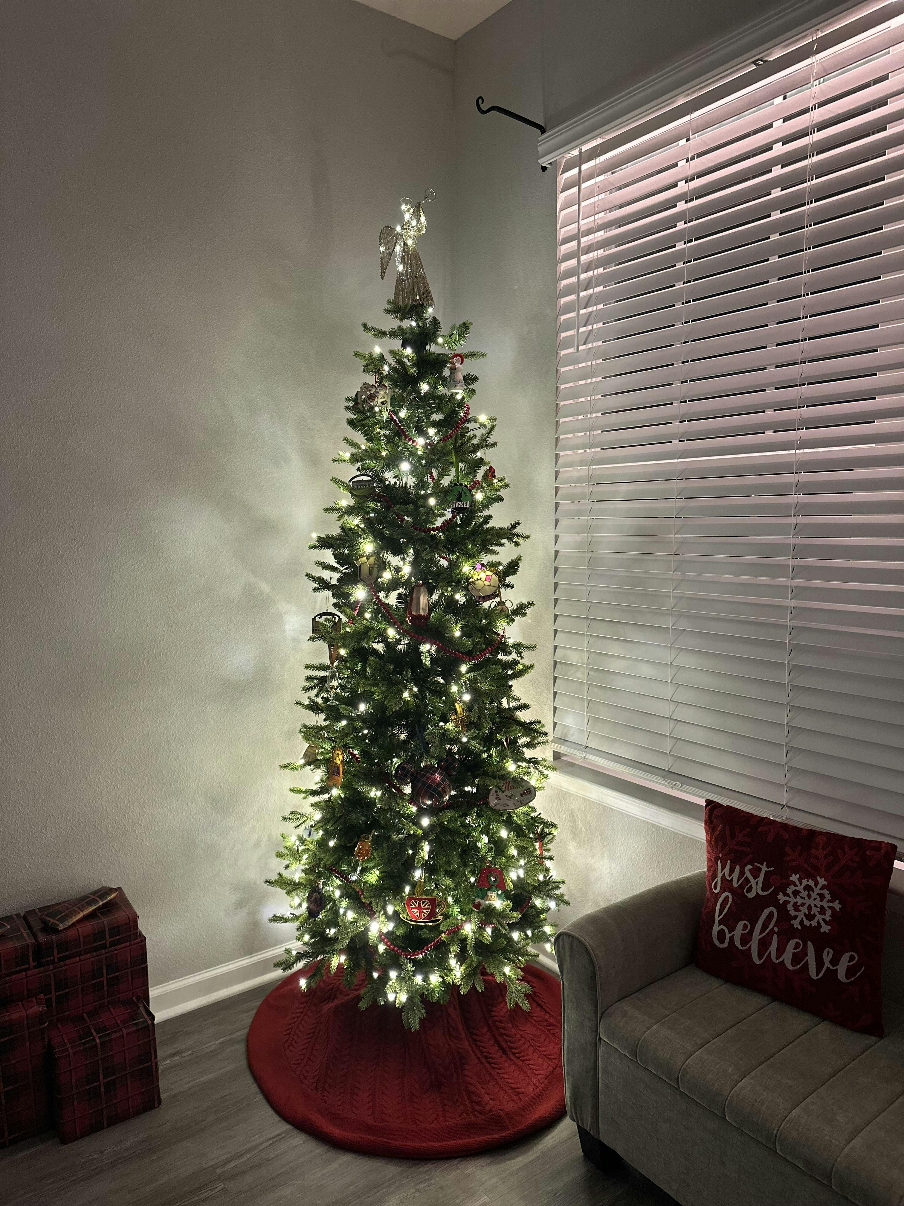 A gorgeous statement piece!!! I’ve owned many artificial Christmas trees and this one absolutely blows the competition out of the water. Beautiful, high quality, easy to assemble and required minimal fluffing to look full. The lights are beautiful and the color changing options are mesmerizing! I love it so much that I am seriously considering leaving it up all year. Best purchase ever!